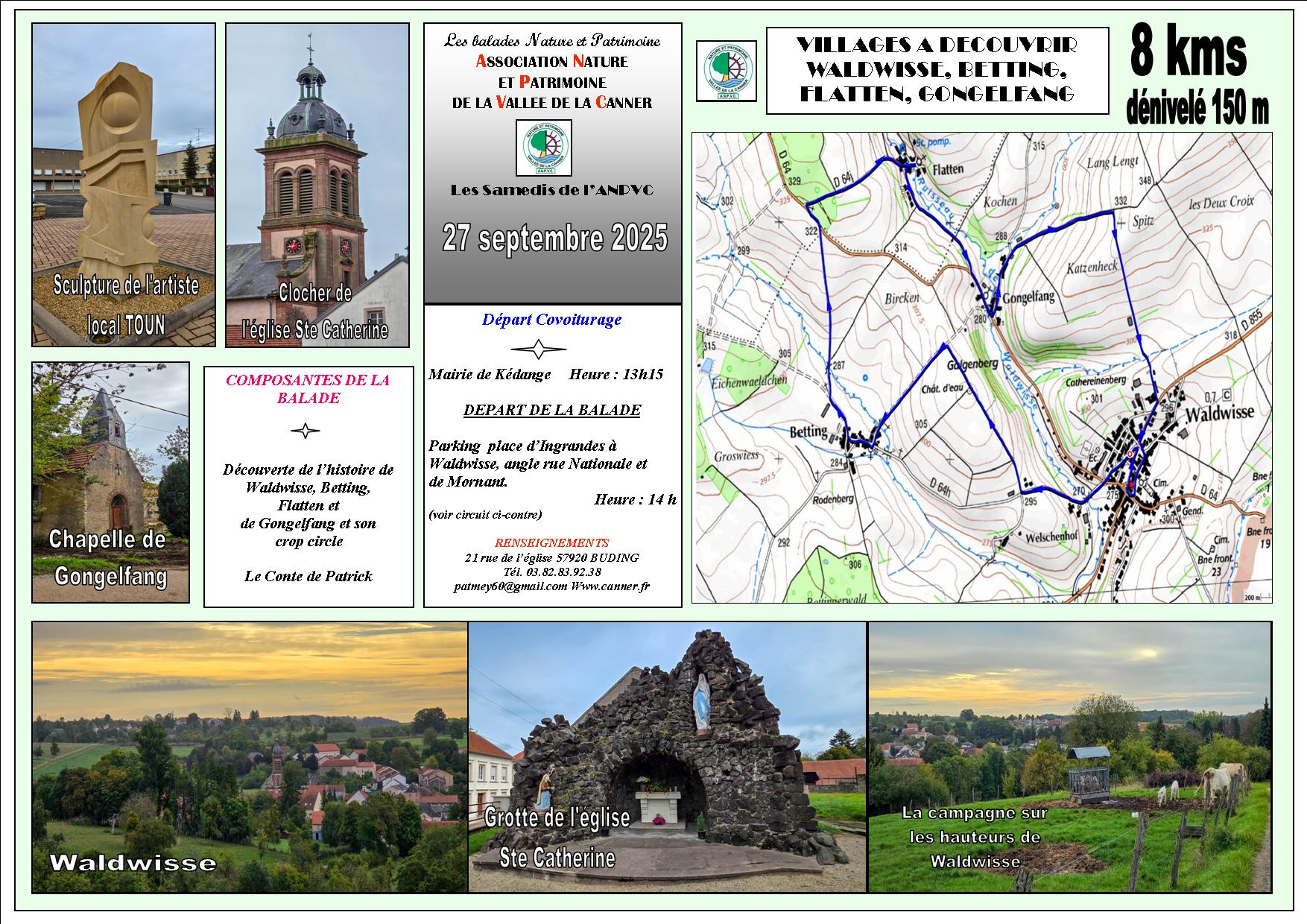 Le premier circuit aux couleurs d’automne se déroulera le samedi 27 septembre 2025 à 14h au départ de Waldwisse, depuis le parking situé Place d’Ingrandes à Waldwisse. Une boucle de 8km vous est proposée pour découvrir Waldwisse et les villages de Betting, Flatten et Gongelfang. Le descriptif détaillé est téléchargeable ici.